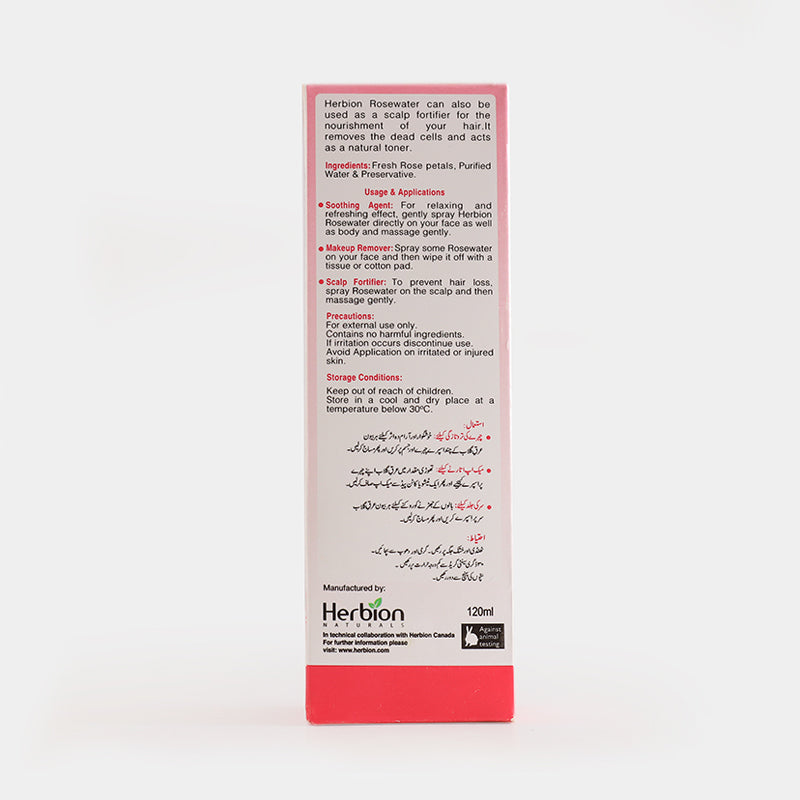Instruction: For relaxing and refreshing effect, gently spray Herbion Rose water directly onto your face and body and then massage.