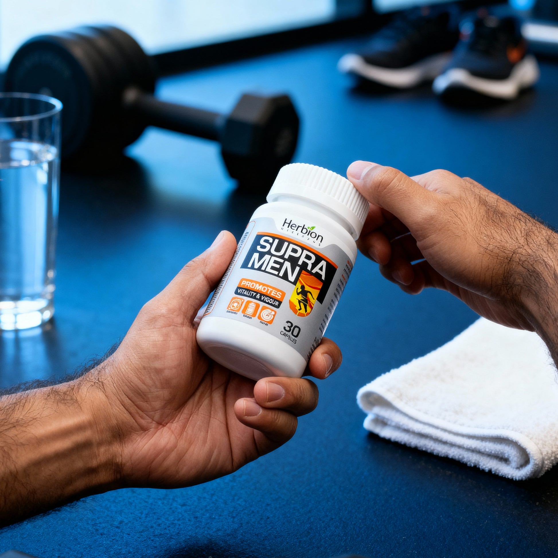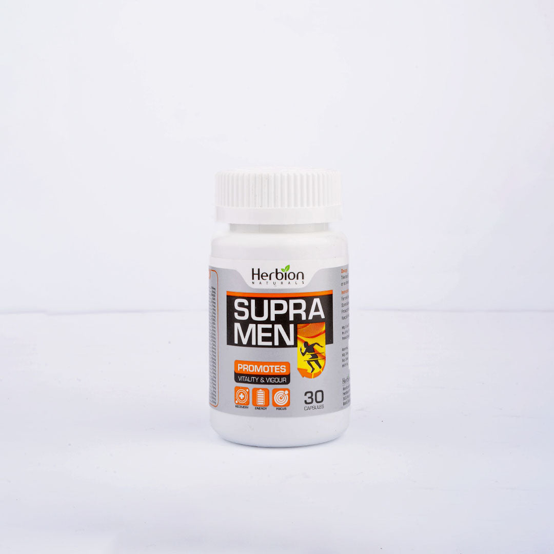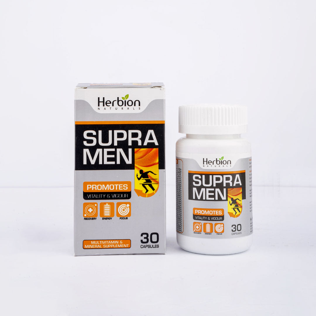 Herbion SUPRAMEN is a comprehensive multivitamin and mineral supplement specially formulated for men. Packed with essential vitamins, minerals, antioxidants, and botanical extracts, it supports daily energy, vitality, muscle strength, prostate health, and overall wellness. A powerful blend designed to help men feel healthier, stronger, and more active every day.